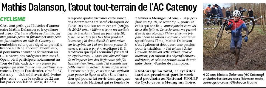 Article de presse après son titre Ufolep départementale de cyclo-cross, sa 2ème place en région Hauts de France et sa 11ème place au National.