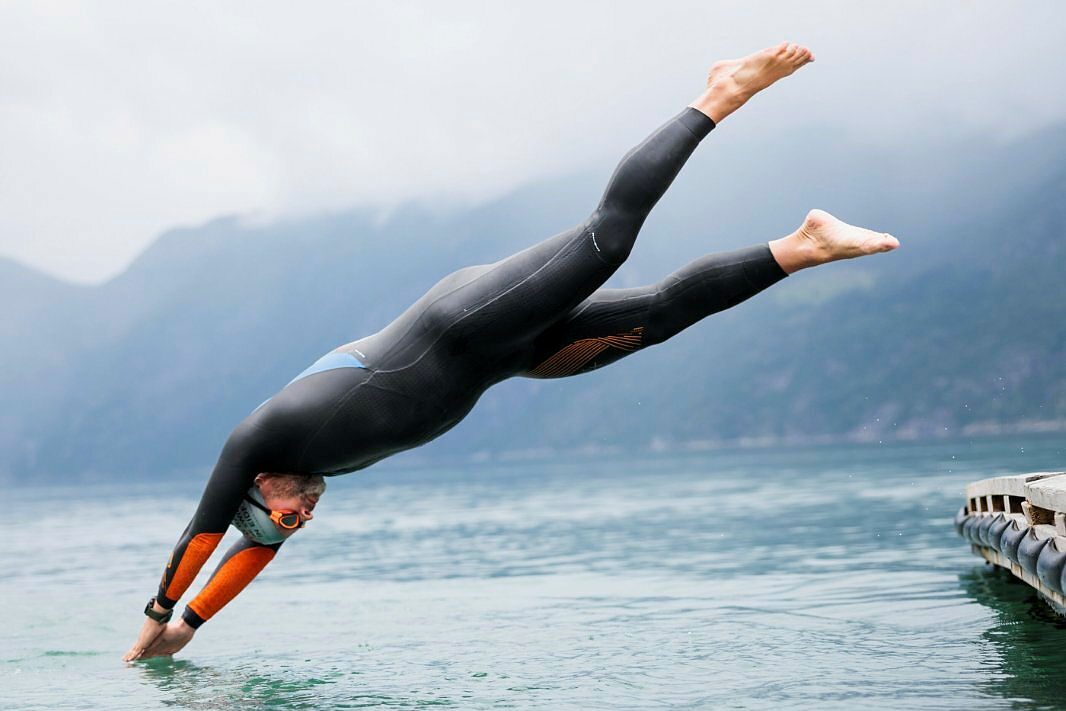 Je vais sur le pont et passe sous la douche. Je ne trouve pas l’eau trop fraiche. En m’approchant du côté du saut, je constate que le ferry est assez loin de la ligne de départ. C’est plus 400 à 500m que nous avons à parcourir que les 200 à 300m annoncés au briefing. Je décide de sauter 5mn plus tôt. 4h45 let’s go pour le saut. Il y a max 3-4m, bien tenir les lunettes, l’entrée dans l’eau est tranquille et la sensation de frais très raisonnable grâce à mon t-shirt néoprène sans manche avec capuche intégrée que j’ai sous ma combinaison. En rejoignant la ligne de départ, je profite du spectacle magnifique des écharpes de brumes qui enserrent les montagnes dans la lumière naissante du jour.